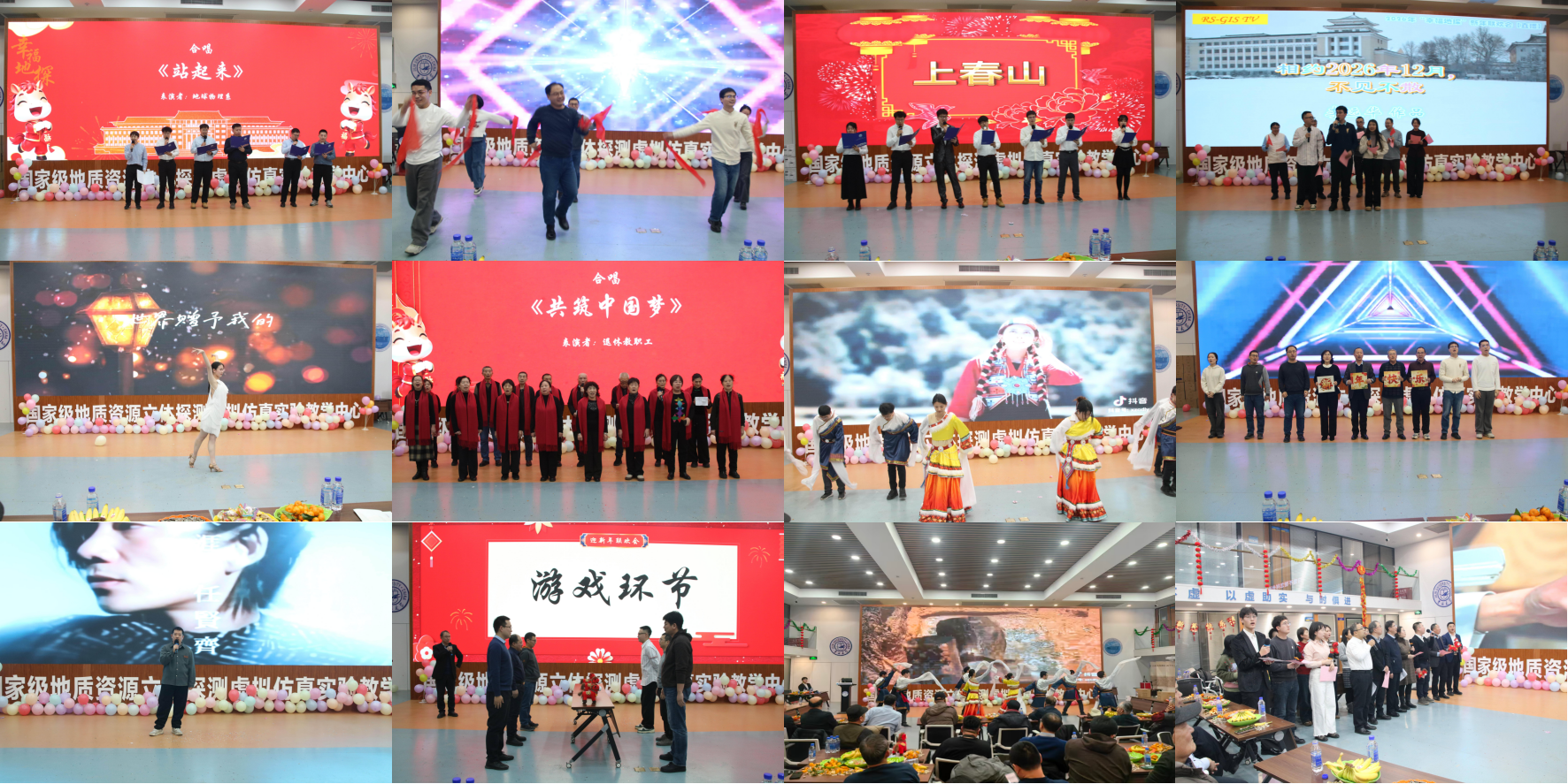 整场联欢会节目形式多样、精彩纷呈。地球物理系带来的合唱《站起来》激昂奋进,测绘工程系的自编广播体操表演充满青春活力;遥感与地理信息系统系一曲《我的未来不是梦》唱出对未来的憧憬;地球化学系教师代表独唱《天涯》深情洒脱;退休教职工合唱《共筑中国梦》饱含家国情怀;新入职教师的《如愿+上春山》展现蓬勃朝气;博士后团队表演的藏族锅庄舞《金色山》热情奔放;学生代表的拉丁舞《世界赠予我的》活力四射;领导班子与行政教职工合唱《时代回响,同心筑梦》将晚会推向高潮。