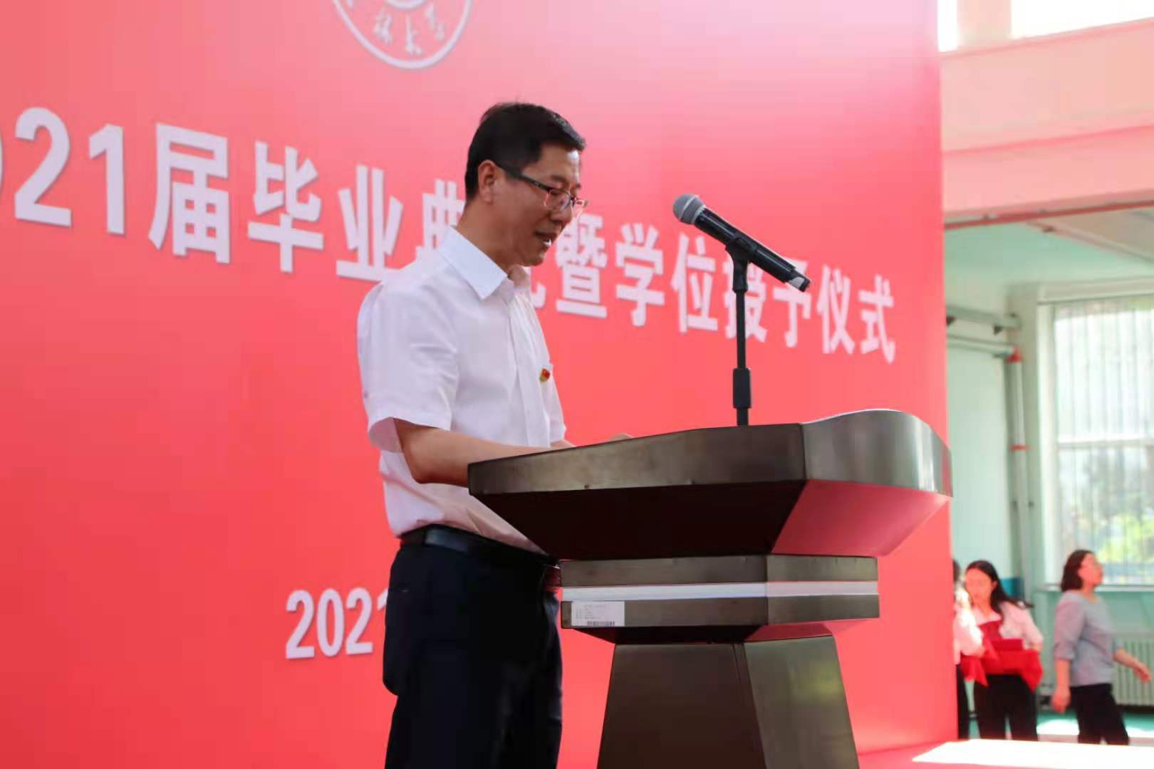 2021年6月22日,9428cn太阳集团2021届毕业典礼暨学位授予仪式在朝阳校区体育馆隆重举行。学校相关部门领导、学院党政领导、院学术委员会和教学委员会主任、各系负责人、2017级本科生班主任和班导师、教师代表、2021届全体毕业生参加了活动。仪式由学院党委副书记兼副院长李洋主持。