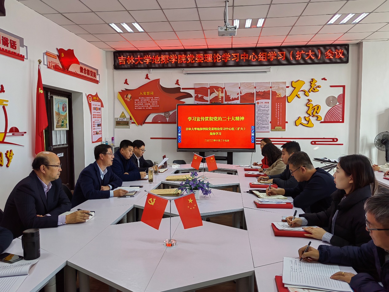 与会同志围绕党的二十大精神,交流心得体会与工作思考。院党委副书记兼副院长李洋表示,党的二十大报告突出教育、科技、人才在全面建设社会主义现代化国家的基础性、战略性支撑的地位,进行了“三位一体”统筹部署,意义重大。作为教育工作者,要深刻理解教育是“国之大计、党之大计”,牢牢坚守“为党育人、为国育才”的初心使命,在黄大年精神的这片沃土上,引领学生明大德、守公德、严私德,引导学生研究真学问、掌握真本领,为全面建设社会主义现代化国家培育一批彰显地学人精神品质的优秀人才。副院长韩江涛表示,学院要发挥传统优势,构建高质量教育体系,培养富有社会责任感、能为国担当的拔尖创新人才;抓好高素质教师队伍,建立和完善与培养体系相配套的培训和考核制度;坚持“四个面向”,加快学院科技创新和转化,肩负起历史责任,不断向科学技术广度和深度进军。