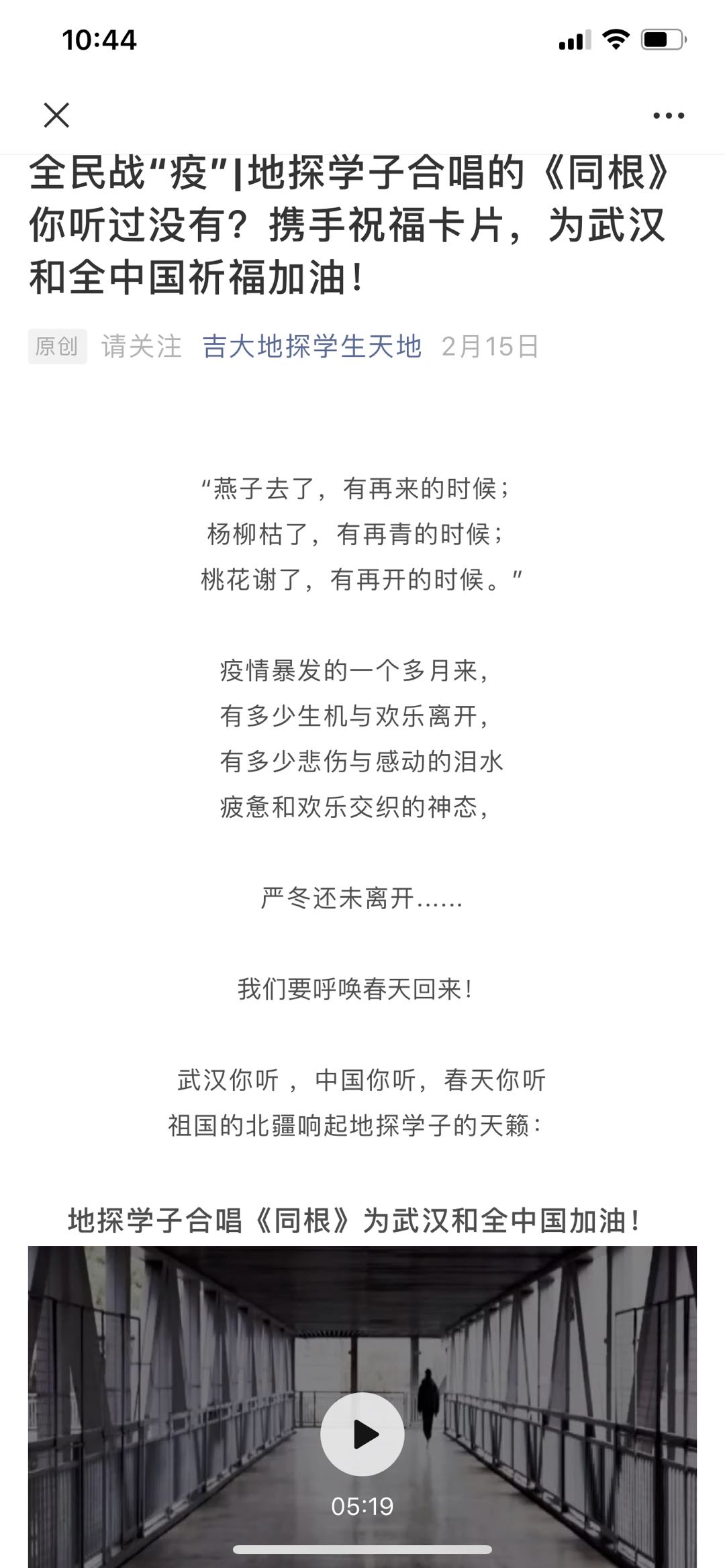 让爱发声,传递温情力量。同学们还自发录制了视频《同根》,依托网络新媒体,向武汉人民送去美好的祝福,每一句“武汉加油,中国加油”都坚定着大家抗击疫情的信心。