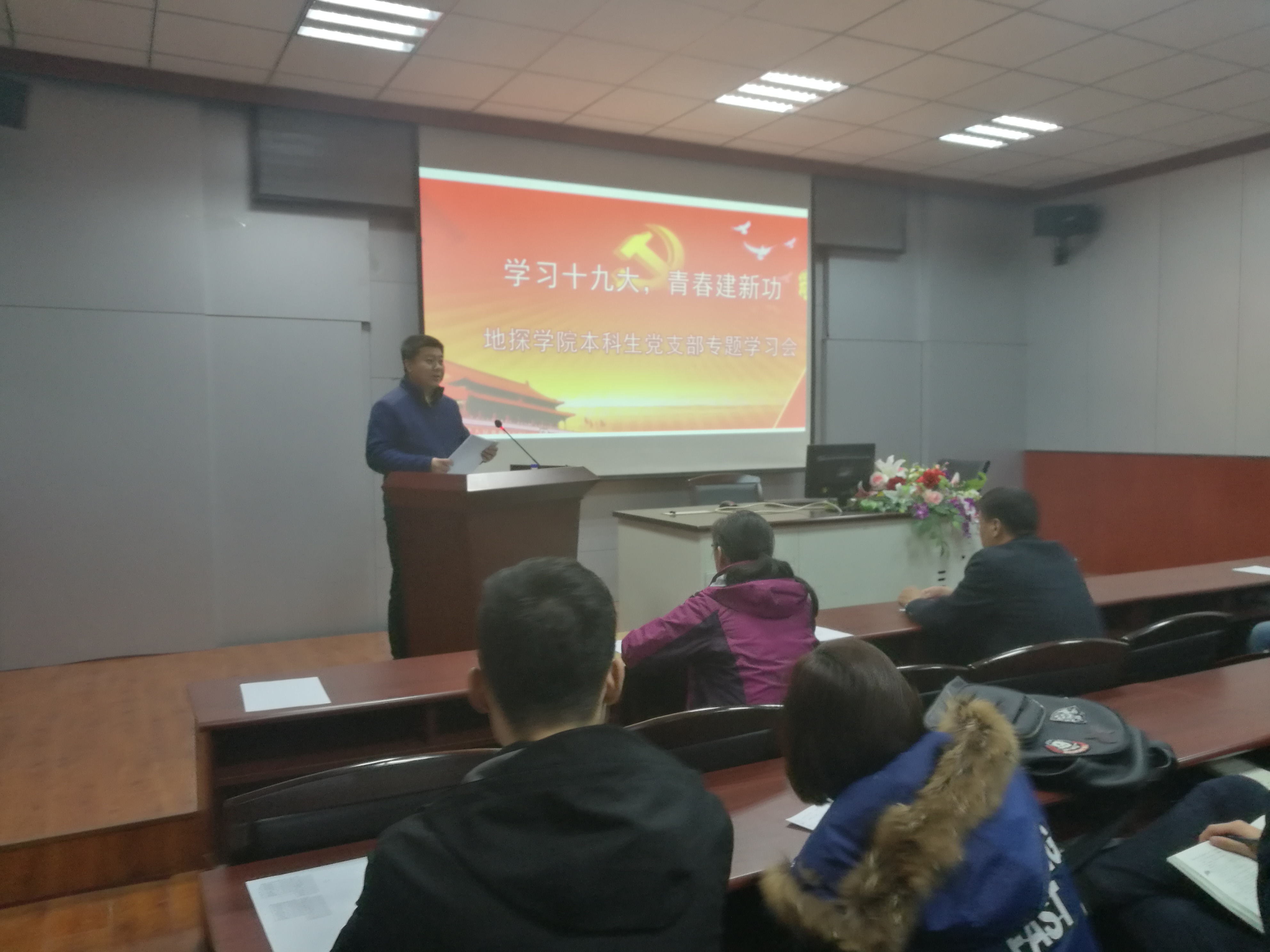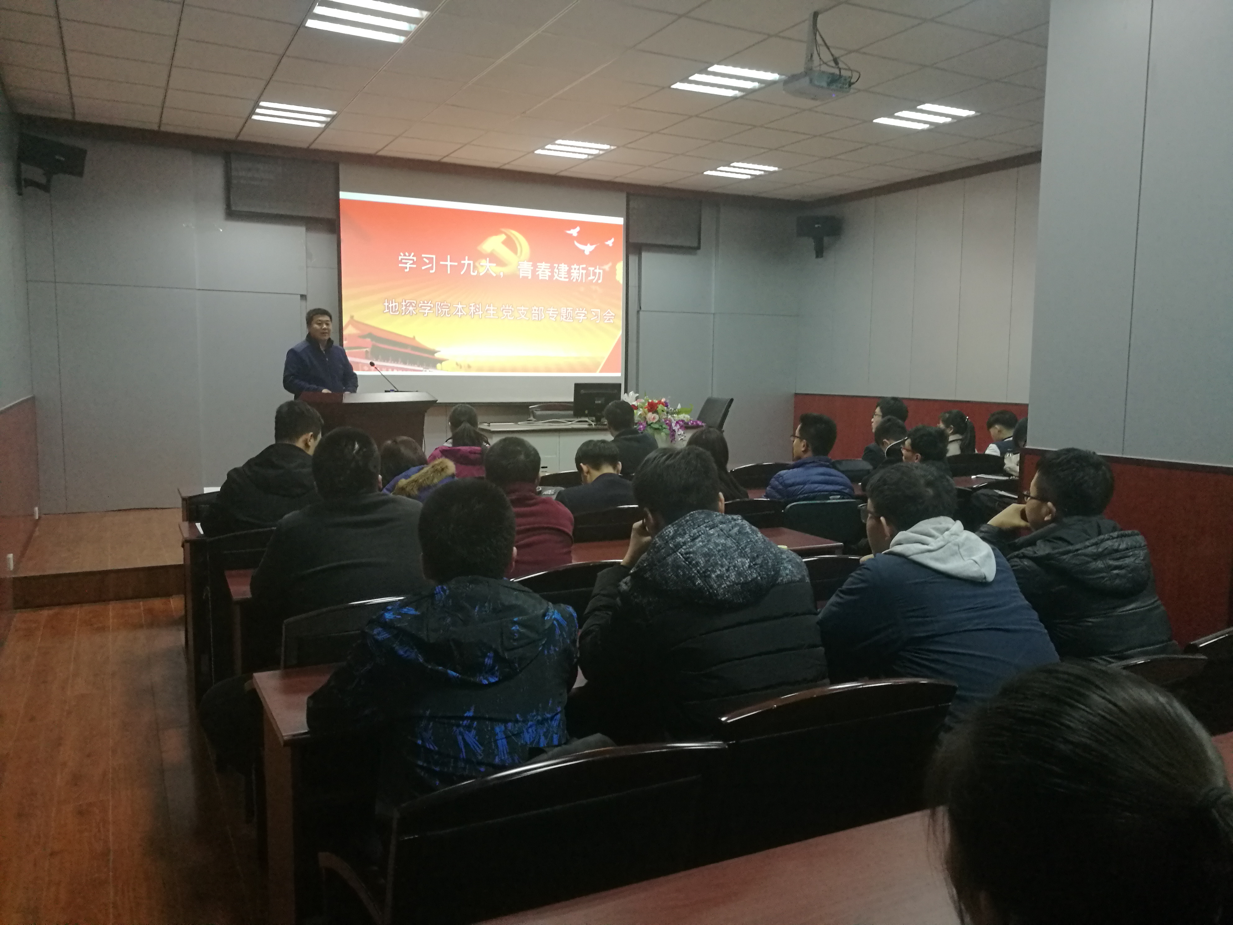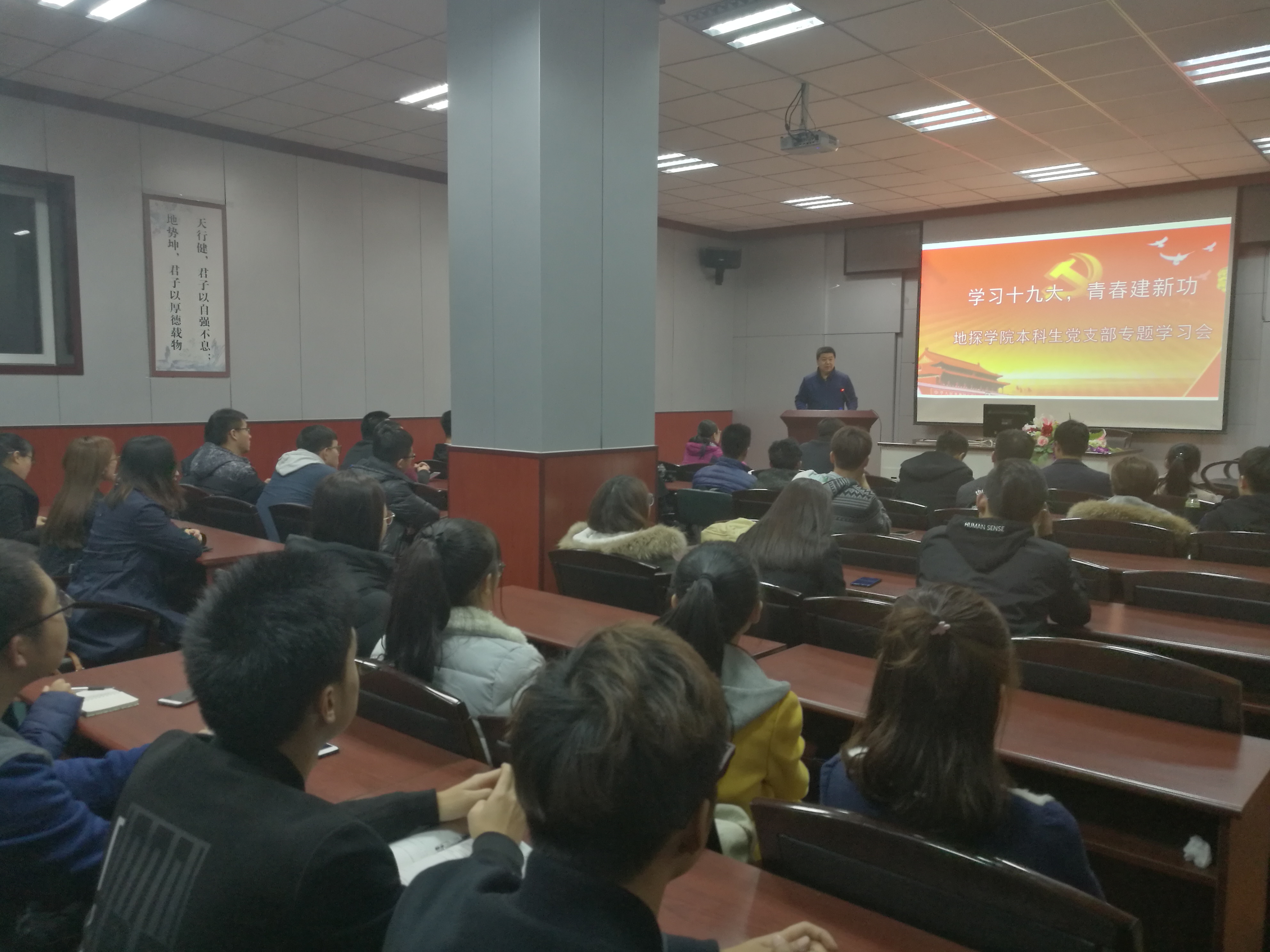 2017年10月24日晚6点,9428cn太阳集团本科生党支部在地质宫449报告厅开展了“学习十九大,青春建新功”专题学习会,9428cn太阳集团党委副书记宋宏宇,学办主任于学武,辅导员金璐,司镇通以及全体本科生党员参加了本次学习。