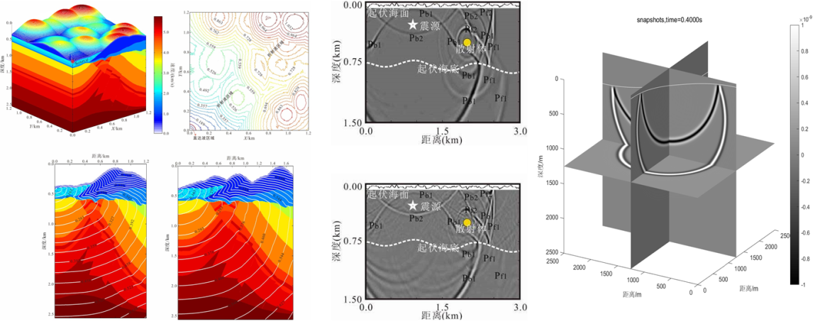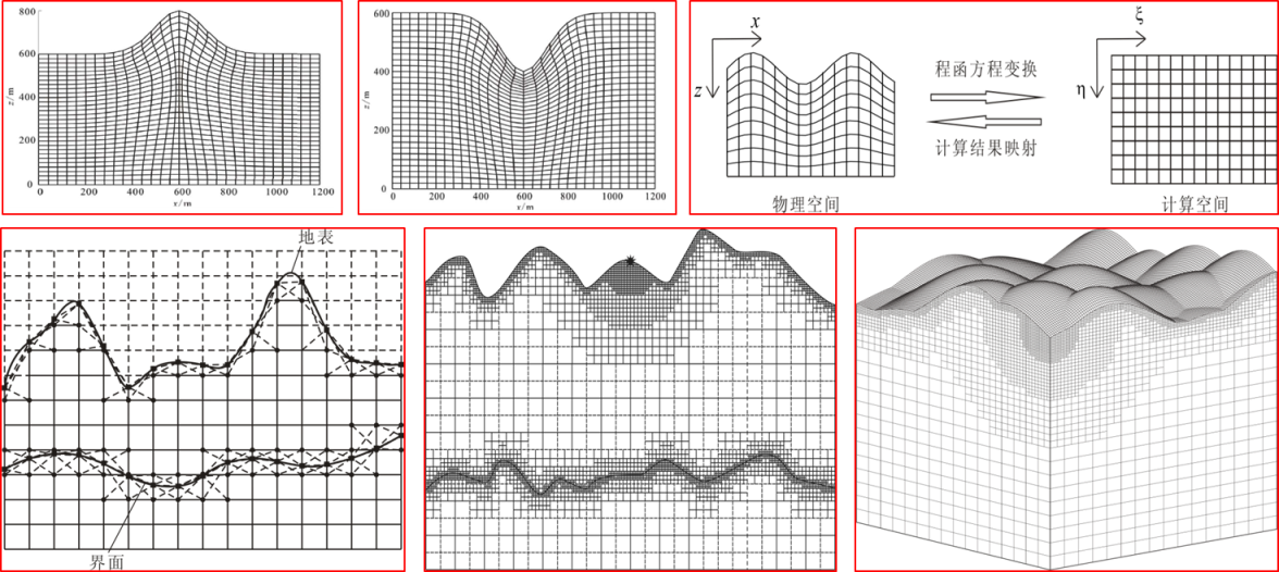 目前在本研究方向上形成了包括射线追踪和波动方程数值模拟在内的全系列正演模拟技术,其核心包括:针对复杂地形的各种网格剖分技术(图1-上)和针对三维不规则计算边界、复杂近地表及地下复杂介质的地震波走时与射线路径计算方法、针对复杂海洋环境的复杂散射波场模拟方法、针对三维复杂地表的波动方程数值模拟方法等地震波正演模拟的高性能数值解法(图1-下)。这些正演模拟技术,在描述我国西部和南海复杂区地震波传播规律和分析鄂尔多斯盆地复杂黄土塬区、塔里木复杂山前带和我国南海复杂海洋环境等区域的低信噪比数据的形成机制方面发挥了重要作用。