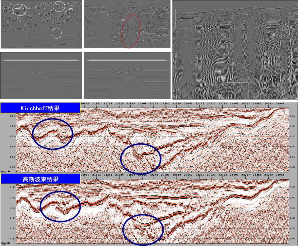 目前在本研究方向上形成了包括Kirchhoff偏移、高斯束偏移和逆时偏移在内的系列地震偏移成像技术,其核心包括:有限孔径Kirchhoff偏移方法,该方法的核心研究成果已被写入欧洲大学教材;高斯束偏移系列成像方法,该方法目前能面向复杂地表、地下复杂高陡构造、各项异性介质、吸收介质、弹性波偏移、快速束和控制束偏移等(图2-上)。逆时偏移系列成像方法,该方法目前能面向复杂地表、多源高性能计算、最小二乘偏移等。上述这些偏移成像方法,以国家科技重大专项为依托,在我国南海复杂区成像方面取得了很好的效果,极大改善了我国南海复杂海底大陡坡、崎岖海底、海底火山等条件存在下的地震成像效果(图2-下),进而为南海石油勘探提供了重要的技术保障。